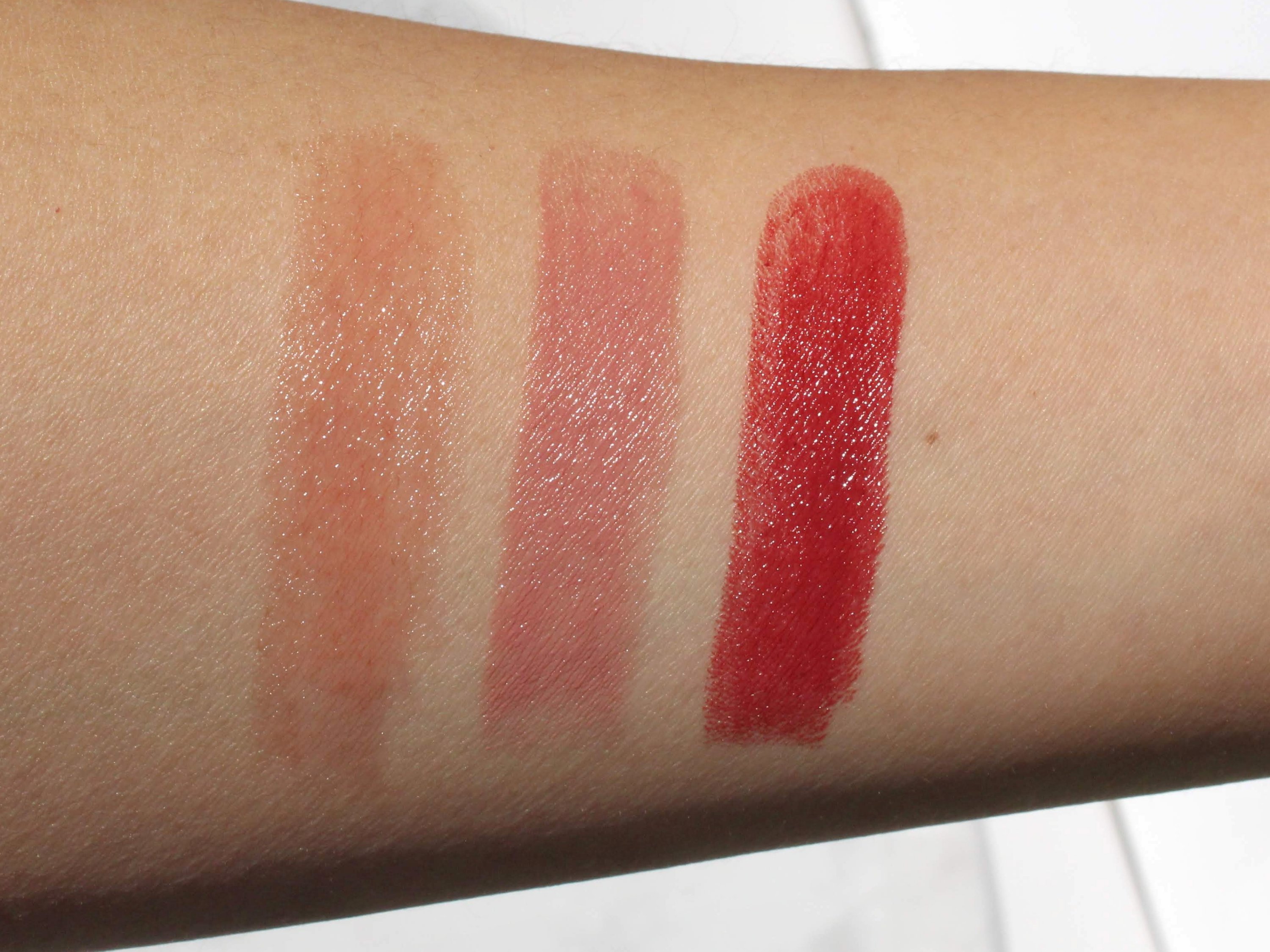 I have 3 different finishes of the lipsticks: shine, natural, and full coverage. They are pretty self explanatory, but the shine formula is a pretty sheer balm like finish; the natural is a light-medium coverage finish with some shine, and the full coverage is a more full coverage cream finish. The tube doesn’t note the finish, but it seems like the 100s are shine, 200s are natural, and 300s are full coverage.