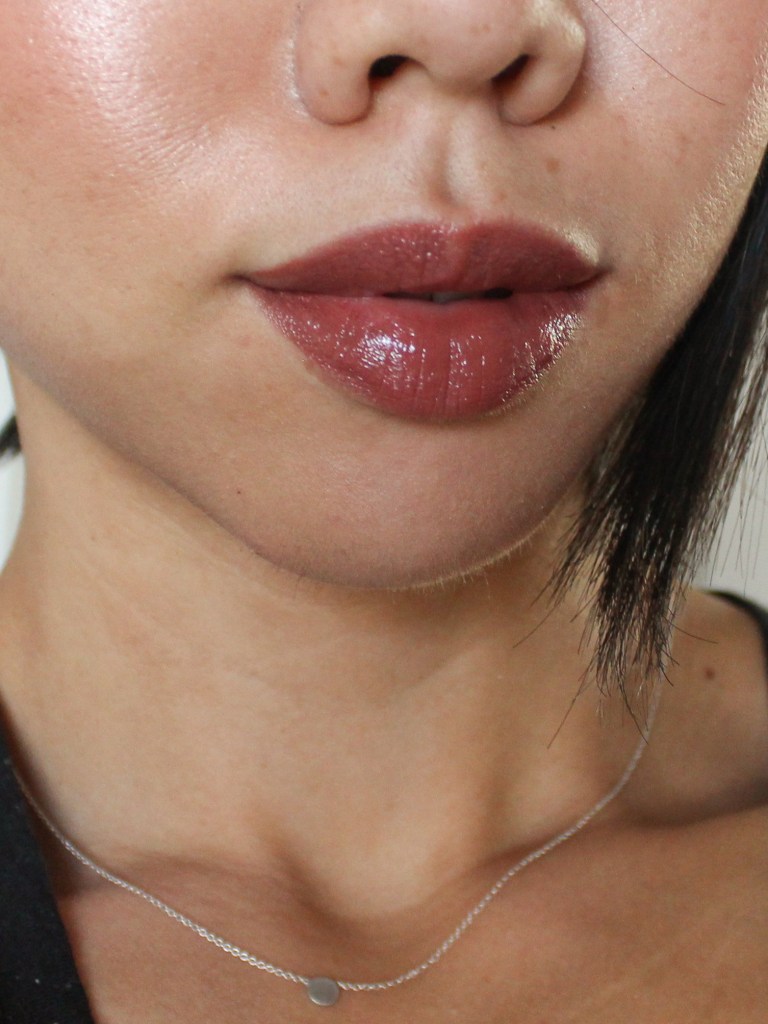 Like the lipsticks, the Kjaer Weis lipgloss formula also impressed me. It’s not like a regular lip gloss. It has a thick plushy formula that feels nourishing and not sticky at all, and sets down into a balmier feel. It has pretty good staying power, and I can wear this for a couple hours without needing to reapply. Fascination is a raspberry pink with some subtle shimmer that gives my lips just a bit of a pinkish tint to brighten up my face.