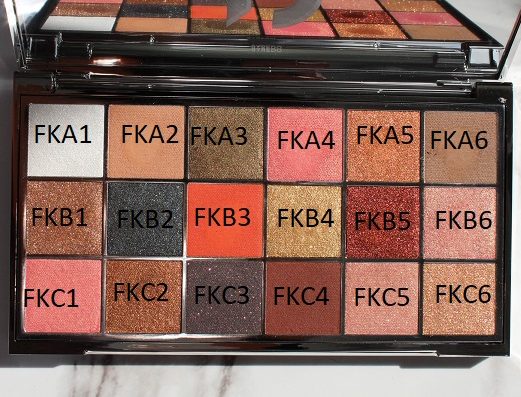I coded each shade in each palette by row (3 rows starting from the top) and column (starting from the left). So the top left corner shade would be shade A1, the shade directly to the right would be shade A2, and the most bottom right would be shade C6. An R in the front (i.e. RA2)indicates the Remembrance palette while FK indicates Flora Kalahari from last year (i.e. shade FKA2)