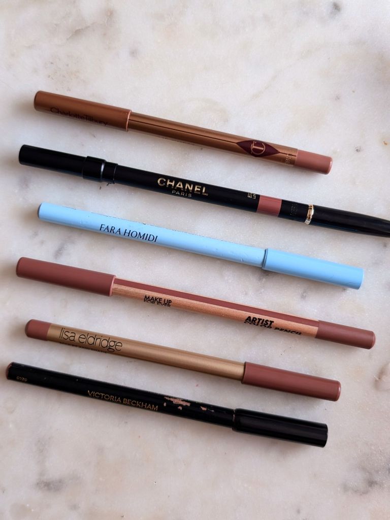 Looking at these 6 formulas together it’s clear I have a preference for a specific type of formula – something soft but not too soft, blendable, creamy, and longwearing. Most of these are wood pencils which have a slightly drier (though not necessarily drying on the lips) and initially have a softer color payoff than a gel liner. The Chanel lip liners are the most long-wearing of these 6, with Charlotte Tilbury following closely behind, although I would consider all 6 to be long-wearing. The LIsa Eldridge and Victoria Beckham formulas are my favorite of these 6 (though not by a long shot) with their soft finish, blendability, and longwear, but I have lip liners I like to use for different occasions.